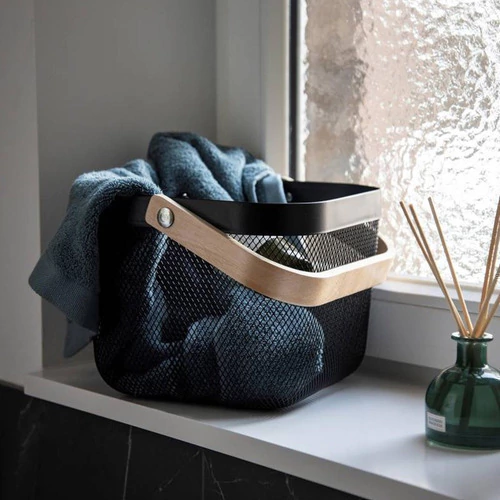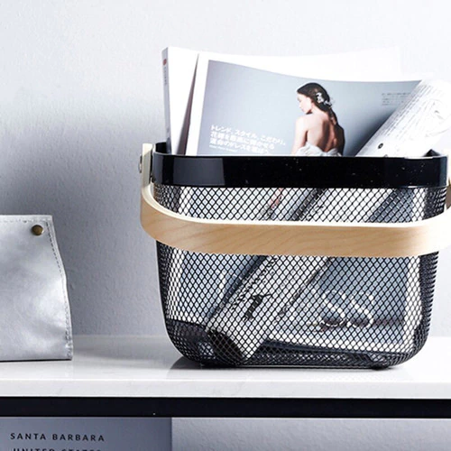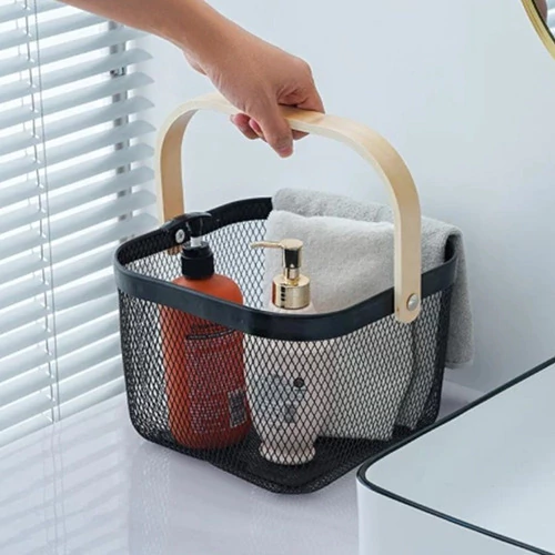 Dale orden y estilo a tus espacios con este canasto organizador de malla metálica con manija de madera, ideal para decorar o almacenar de forma práctica y moderna.