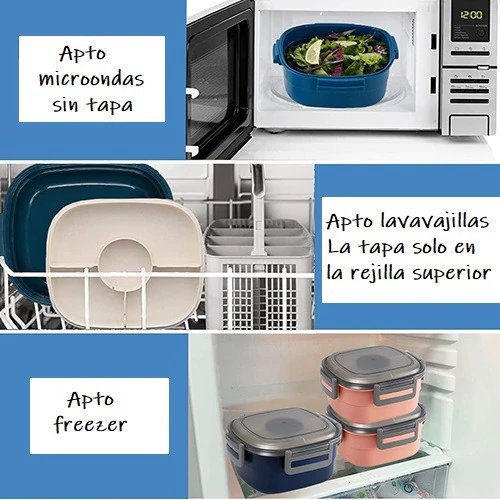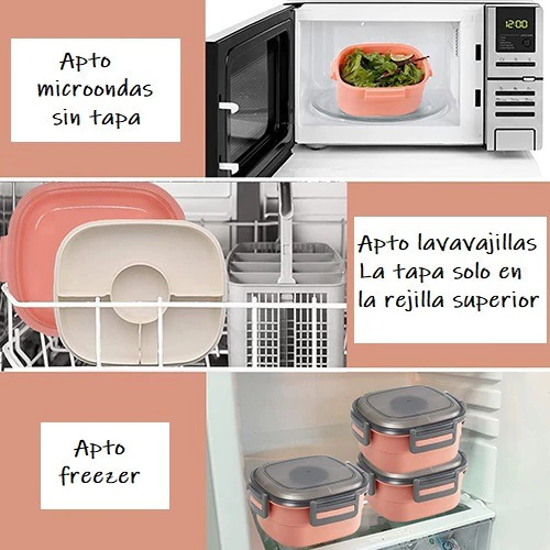 • Apta para microondas (sin tapa), lavavajillas (sin tapa) y freezer