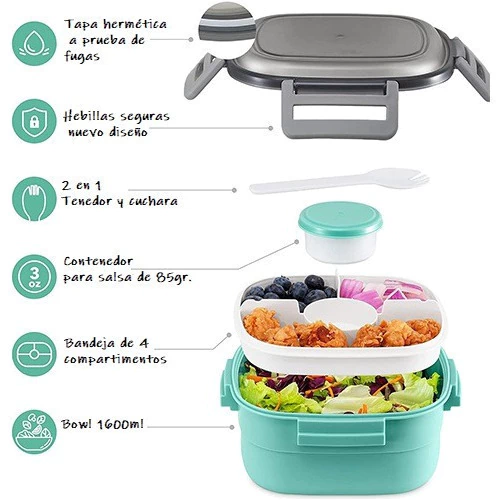 • Incluye: Cuchara reutilizable, salsera y bandeja de 4 compartimentos