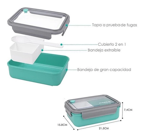 Su formato rectangular con 3 compartimentos desmontables permite mantener tus comidas separadas y organizadas, evitando que los sabores se mezclen. Ideal para almuerzos saludables en el trabajo, la facultad o al aire libre.