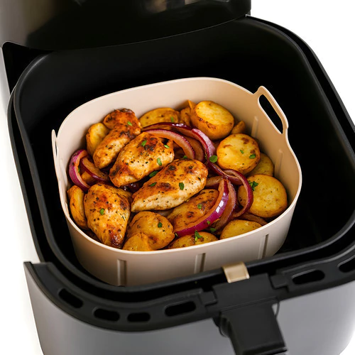 Este molde cuadrado de silicona para freidora de aire es la solución perfecta para cocinar de forma práctica, limpia y saludable.