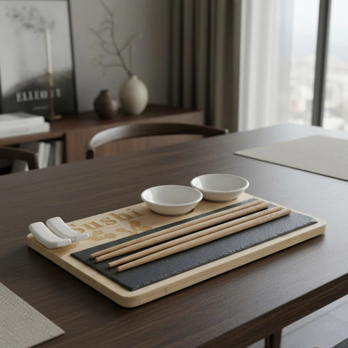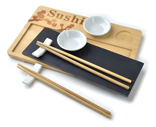 Este set de sushi para 2 personas combina bambú y laja en un diseño elegante, minimalista y resistente: perfecto para quienes disfrutan de una buena presentación al comer.
